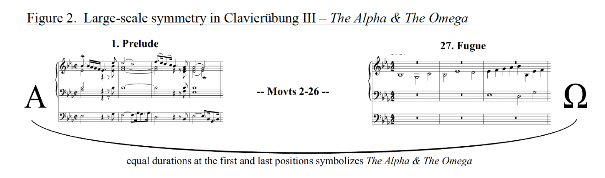 In Chapter 3 it is shown that Bach often gave first and last movements equal durations in multi-movement works or in groups of movements, which symbolizes the unity of the first and last or The Alpha & The Omega. The first and last letters of the classical Greek alphabet, Α and Ω, symbolize that Jesus has existed for all eternity, from the beginning to end of time. Securing the bookends with related durations (usually 1:1) was Bach’s preferred technique to unify large-scale collections. It is a simple yet highly effective technique that imbues multi-movement works with an enduring theological truth and esthetically satisfying large-scale symmetry. For example, Bach used this technique in the Schübler Chorales (discussed in two chapters previously) as well as in many other key works discussed in Chapter 3.