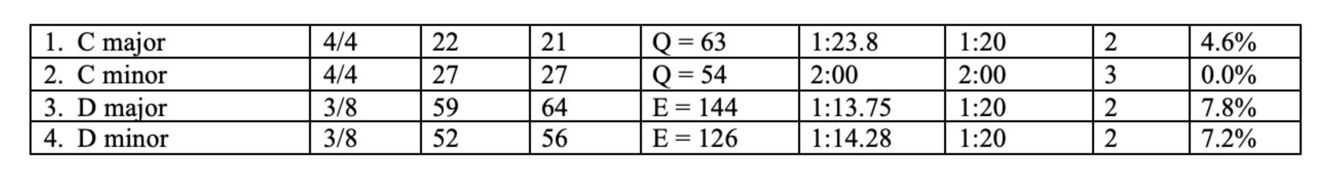 Inventions 1 and 15 have equal measures, 22, and equal tempos, Q = 63, resulting in equal durations. One less measure for both inventions, 21, results in equal durations of 1:20. The equal measures, tempo and durations for the first and last inventions imbue the set with outer-parameter symmetry which symbolizes The Alpha & The Omega (as discussed in a previous chapter).
