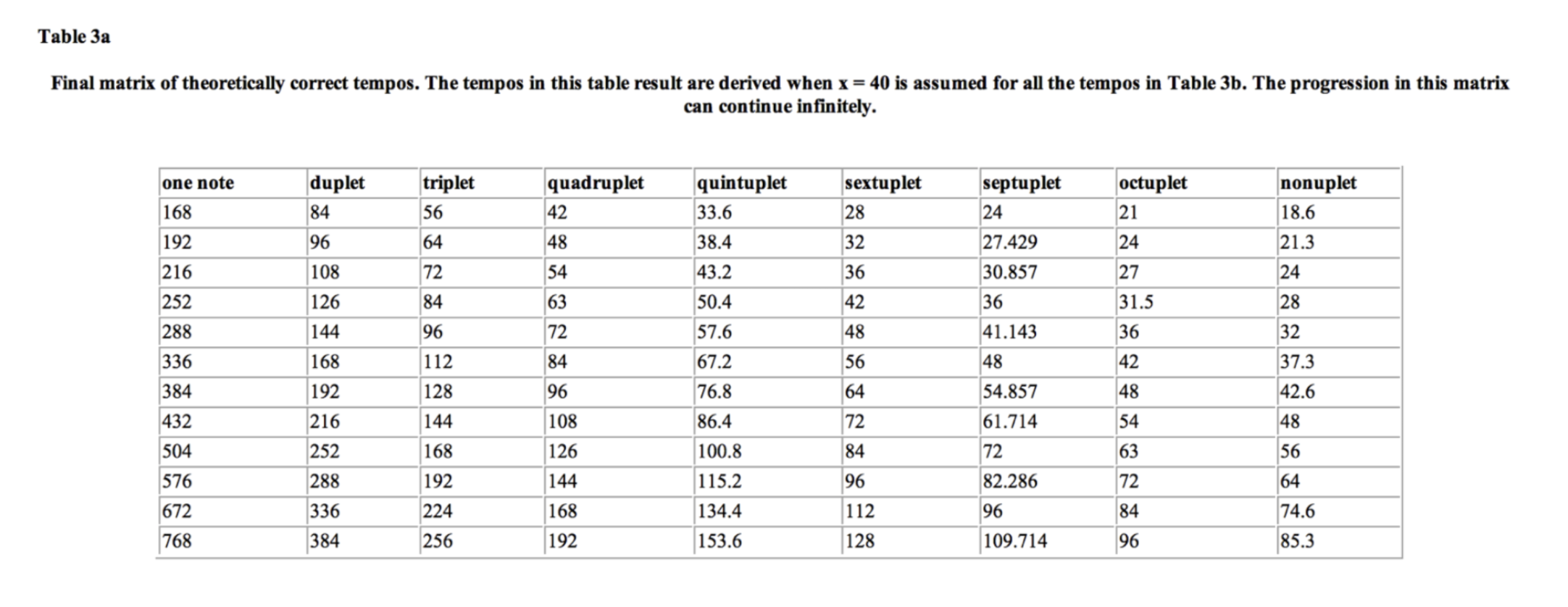 In sum, theoretically correct tempos may be only those integers in the left column of Table 1 (the “slow” column) — that is, only the tempos shown in bold. We can now organize these tempos into a matrix where the first column consists exclusively of the bold-faced integers in Table 1, and each column lists the corresponding tempo of this integer divided by two to nine. In other words, the single note in each row remains at one constant speed. Since 42 beats per minute is the slowest that a pulse can be before being subdivided, then we will begin the matrix with this speed. The matrix can continue infinitely, but for practical purposes ends with perhaps the fastest speed that is humanly possible. (See Table 2.)